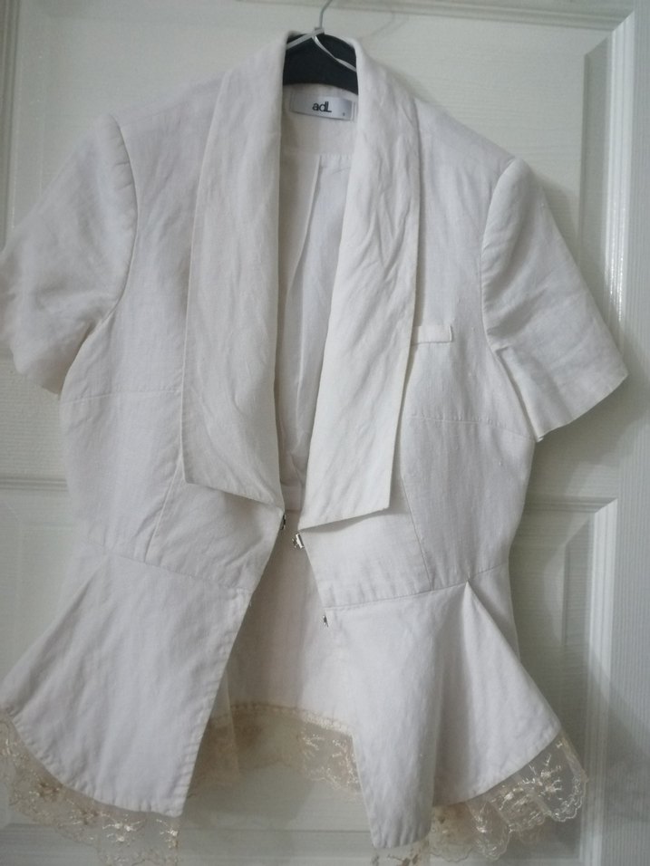 Beyaz keten kumaştan yapılmış, kısa kollu, düğmeli ve kısa kesim kadın blazer. Ofis için uygun, Paris tarzı ve modern görünümlü.Dantel detay çıkrtılabilir şekilde.