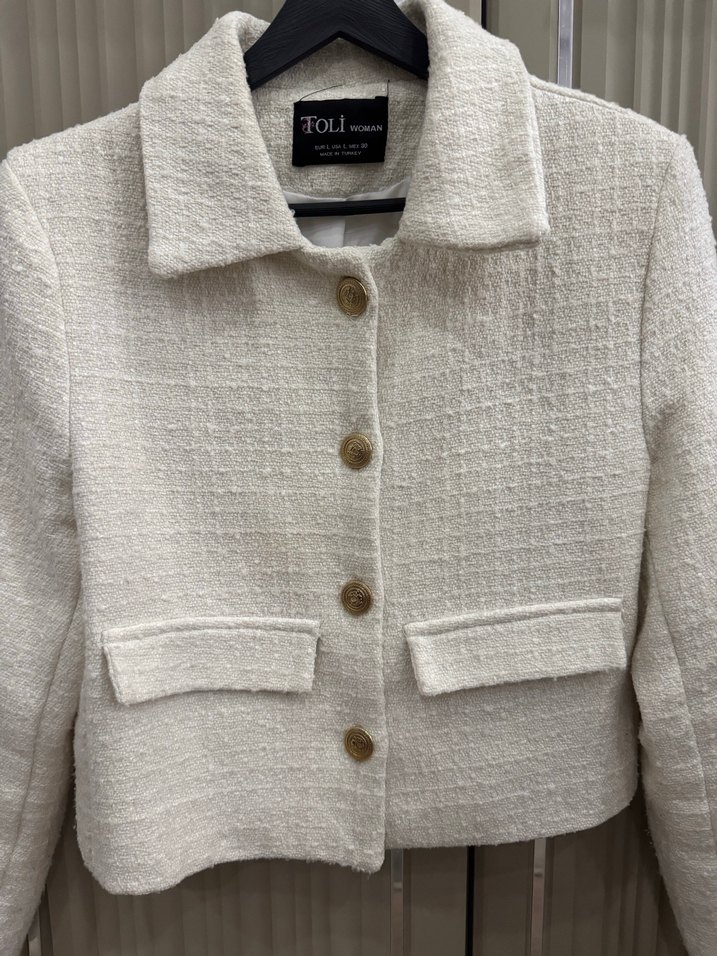 Düğmeli önü, kesik yaka ve uzun kollu kısa beyaz keten ceket, rahat ve şık bir günlük stil sunar. 38 beden de tercih edebilir
