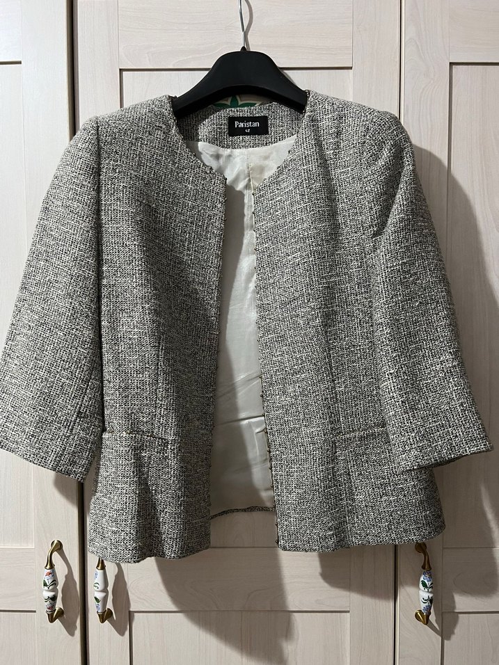 Yün kumaştan yapılmış, düğmeli ve kısa kesim gri kadın ceket. Regular fit ve uzun kolludur, ofis ve sokak stiline uygundur.