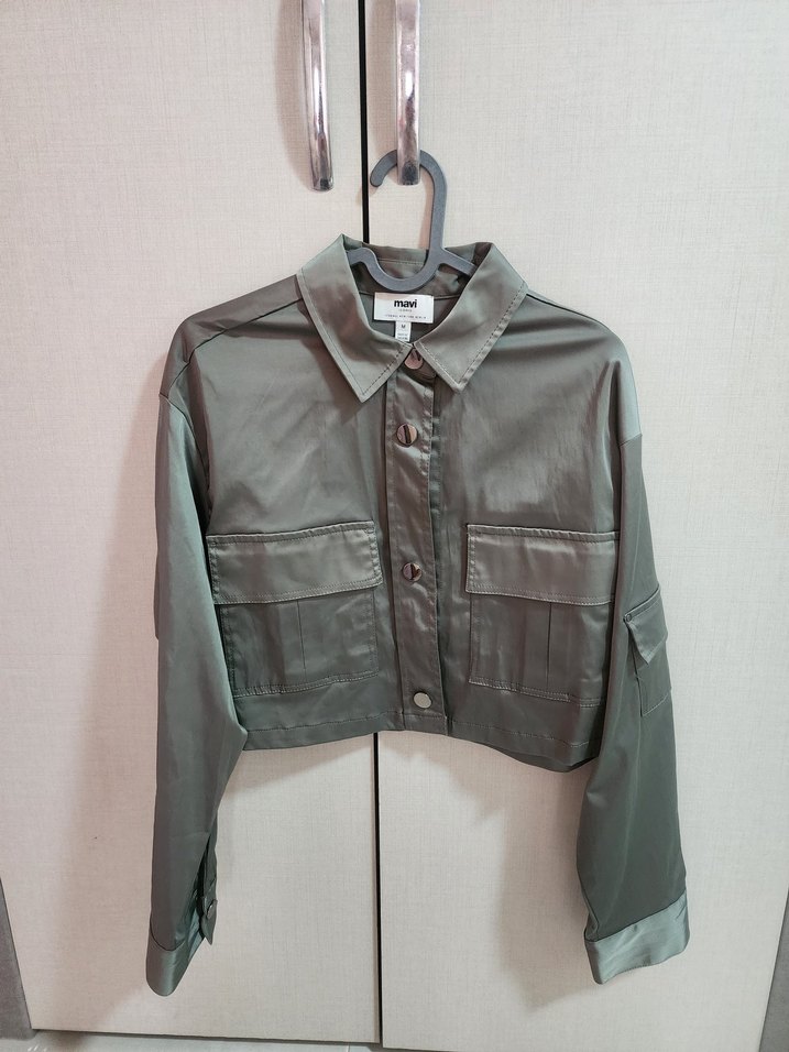 Düğmeli önü ve uzun kollu, kısa kesim bol kadın ceketi. Pürüzsüz sentetik kumaştan, çentikli yaka ve gri tonunda, sokak stiline uygun. Takım pantolonu için mesaj atın