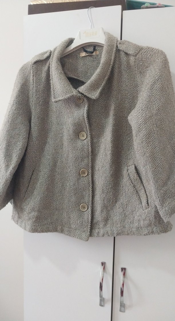 Gri keten kumaştan, düğmeli ve kısa kesim kadın ceketi. Uzun kollu, geniş kesim ve klasik yaka detaylı, günlük kullanıma uygun.
