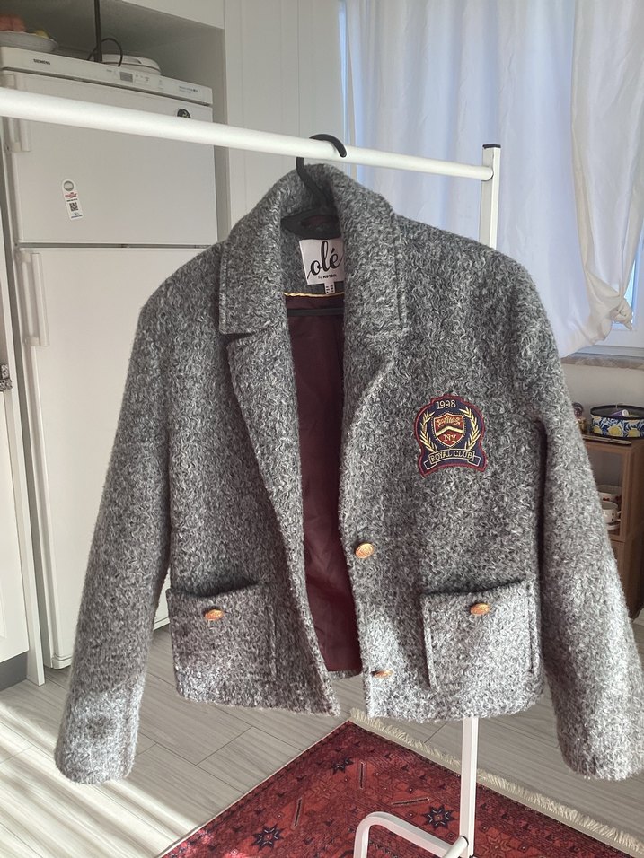 Gri yün kumaştan kısa kesim, düğmeli ve baskılı armalı kadın ceket. Uzun kollu ve rahat kalıplı, günlük sokak stili için uygundur.