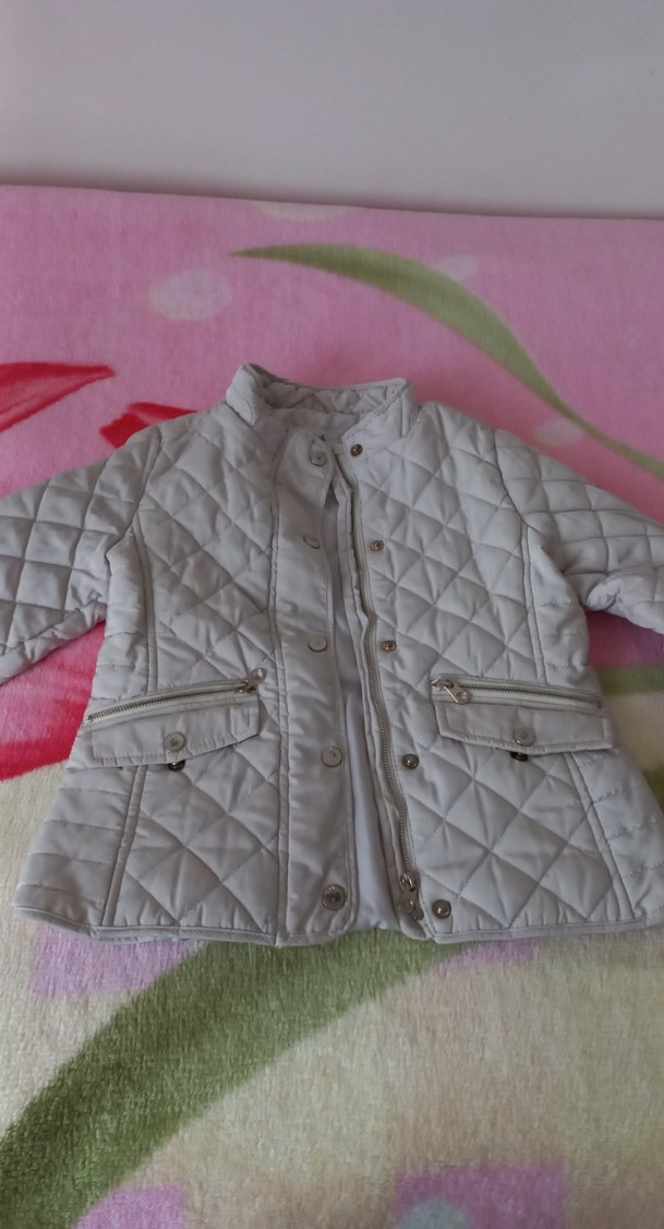 Düğmeli, kısa kesim ve dar kesim gri çocuk ceketi, uzun kollu ve kesimli yakaya sahip, yumuşak sentetik kumaştan üretilmiştir. Sokak stiline uygun, günlük kullanıma elverişlidir. Bir kaç yerinde boya kalemi ucu kadar noktalar var.