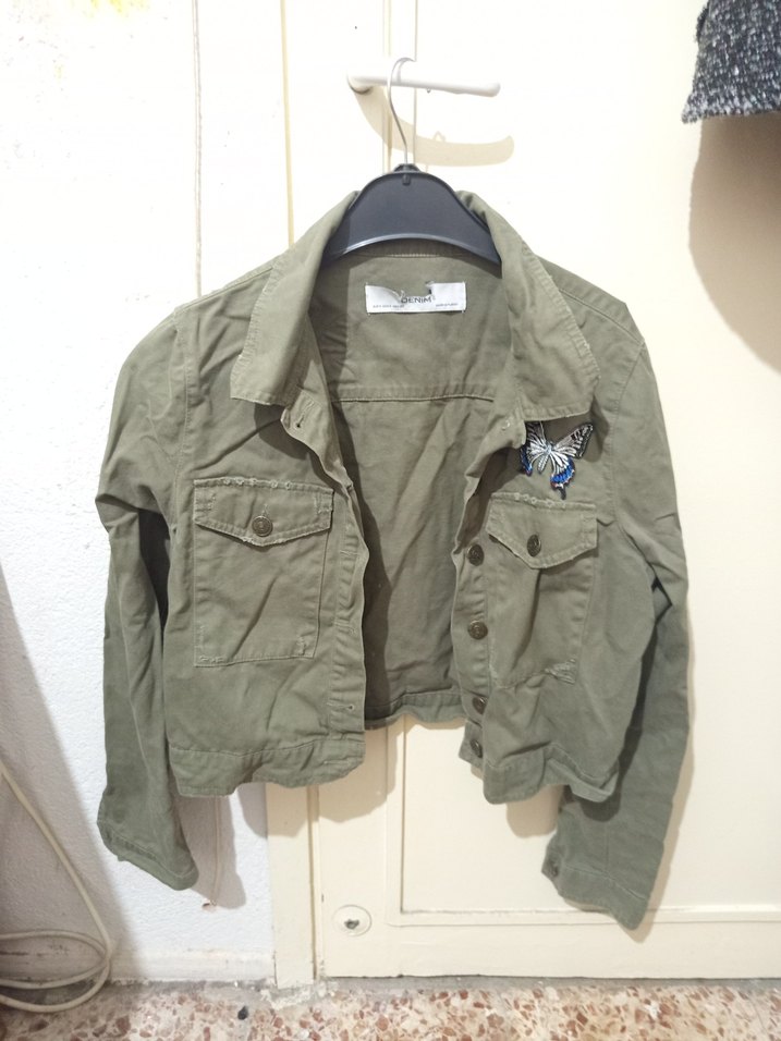 Düğmeli, uzun kollu, kısa kesim kadın ceket. Bej renkli tekstil malzemeden, kamuflaj desenli ve kelebek işlemeli. Rahat ve salaş kesim, dış mekan kullanımı için uygun. Hıc Bi sorunu yok sadece etiketi yırtılmış