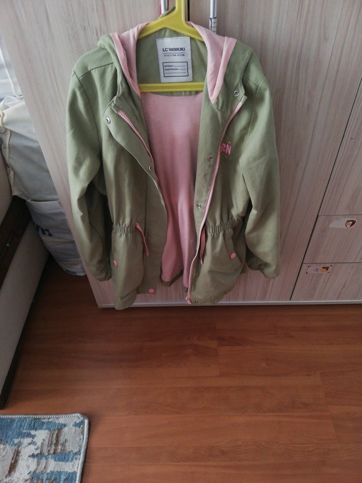 Kadın ceket, düğmeli ve geniş kesimdir. Uzun kollu ve kesik yakalıdır, pastel pembe renkte yumuşak ve sıcak kumaştan yapılmıştır. Günlük kullanıma uygundur. kız çocuk montu 11- 12 yaş