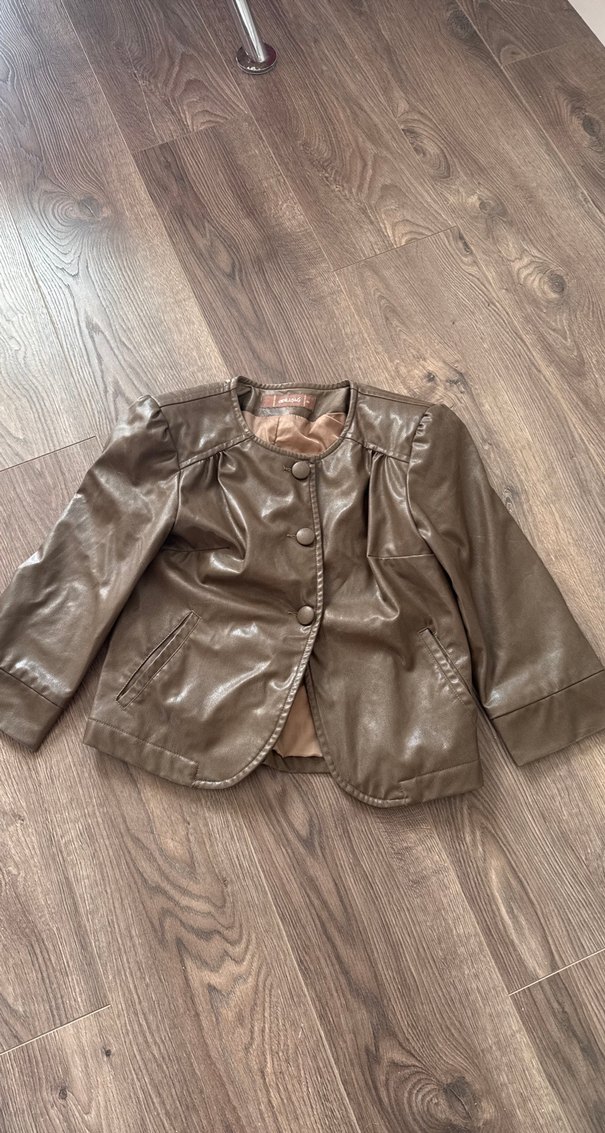 Düğmeli, uzun kollu, kısa ve fitted kesim kahverengi deri ceket, notlu yaka detaylı, günlük kullanım için uygundur.