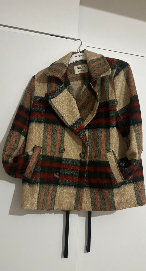 Kahverengi yün kumaştan, düğmeli kısa kaban. Notched lapel yakalı, bol kesim ve uzun kolludur. Sokak modası için uygundur. Kesın alıcılar yazsın
