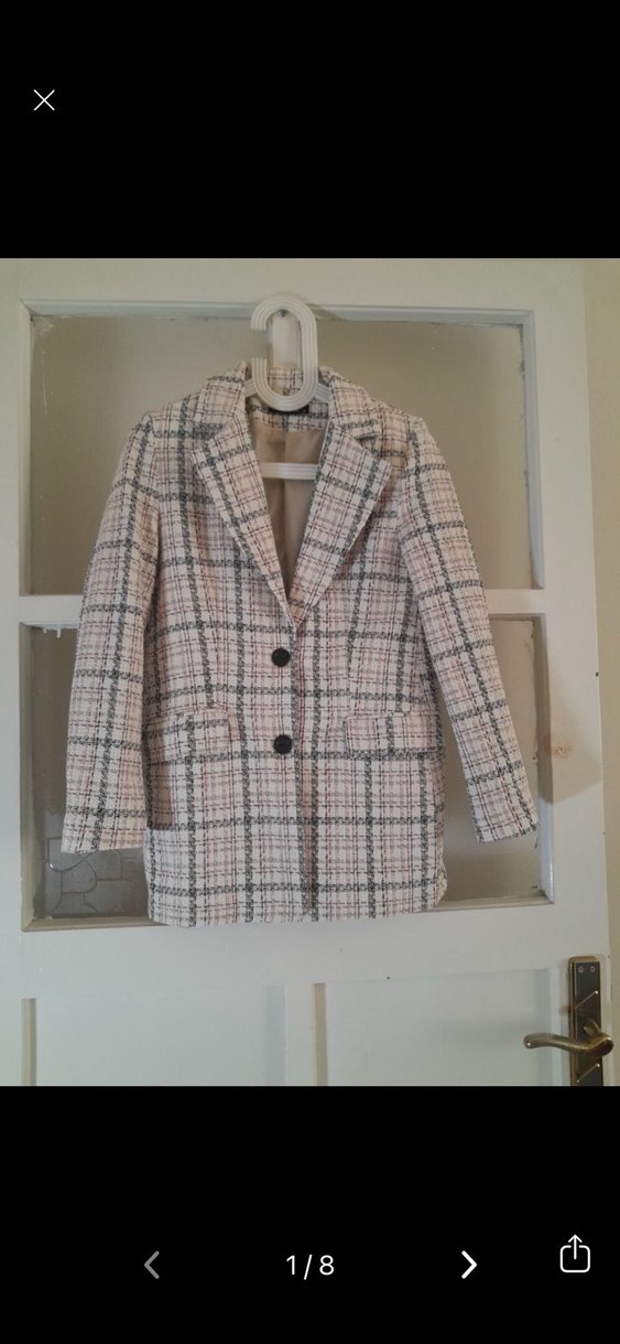Bej renkli, ekose desenli kadın blazer. Düğmeli, kısa kesim ve regular fit. Uzun kollu, ofis ve ya günlük kullandım için uygun şık tasarım. 55 kiloyum malesef bana bir tık çeker dar geliyor sanırı. 50 ve ya 52 kilo olan birisine tam olur iade yok ölçülere bakıp alın lütfen hiç bir sorunu yoktur yeniden farksız çok güzel duruyor marka temsili