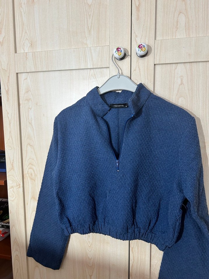 Düğmeli Kısa Kesim Mavi Kadın Triko