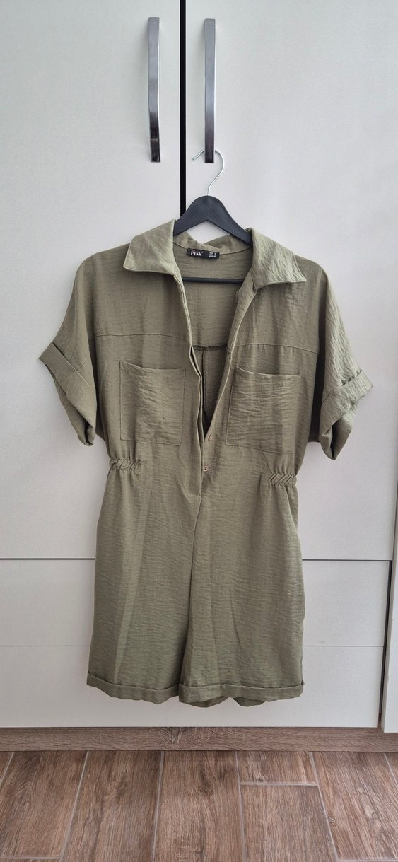 Yumuşak keten kumaştan, düğmeli, kısa kollu ve yaka detaylı bol kesim kısa tulum. Günlük sokak stili için uygundur. Cepli. Yaz ayı için rahat ve kullanışlı. 1 Kere 1 saatlik direksiyon dersi icin giyildi.