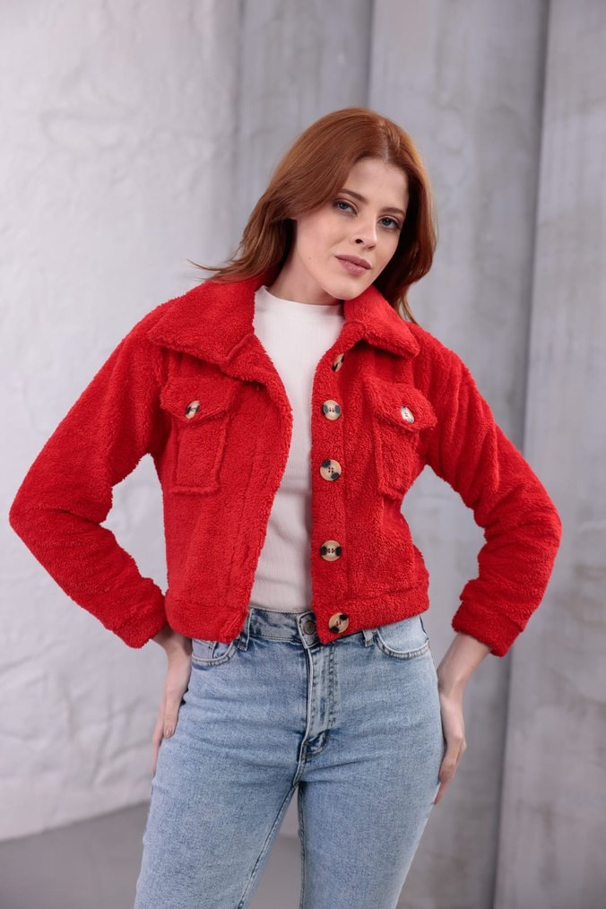 Düğmeli kısa kırmızı ceket, bol kesim, yakalı ve uzun kollu. Yumuşak dokulu, cepli ve rahat sokak stili için uygun. tum bedenleri mevcuttur.S M L