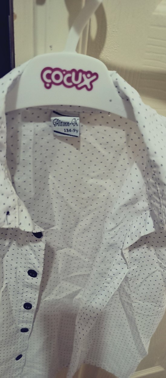 Pamuklu, beyaz, baskılı ve düğmeli, kısa kollu, kesimli çocuk gömleği. Günlük rahat sokak stiline uygun.9 yaş sıfır gomlek
