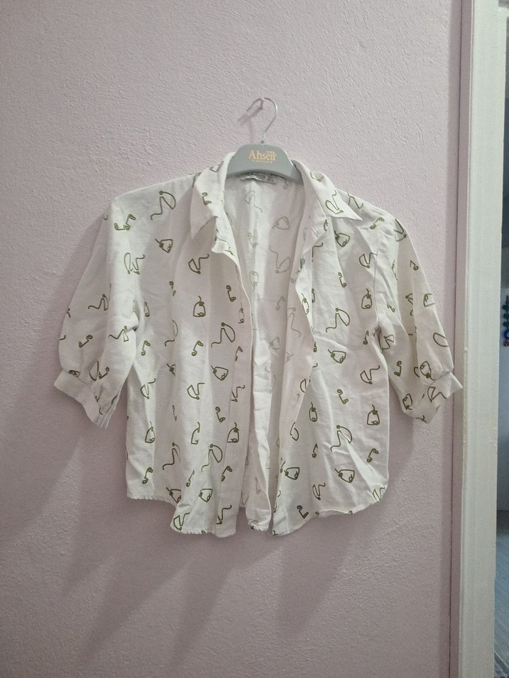 l yaziyor ama s m icin daha uygun bir beden esnemiykr beyaz keten gömlek, kısa kollu ve düğmeli. Baskılı deseni, yakalı ve bol kesimiyle günlük sokak stiline uygun.