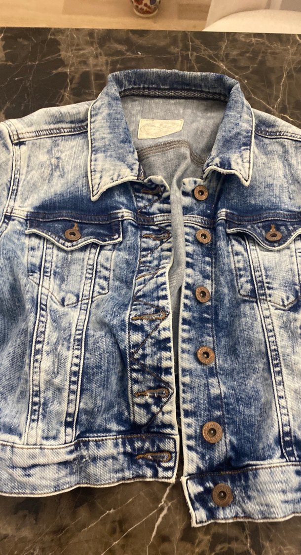 Düğmeli, kısa kollu ve kesimli yapısıyla bu kadın kot ceket, gri-mavi batik desenlidir. Normal midi uzunlukta, günlük sokak stiline uygundur.