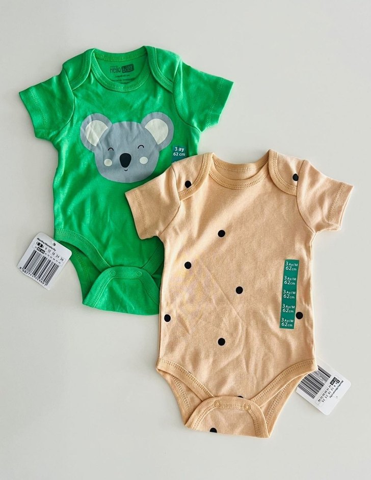 Pamuklu, düğmeli ve baskılı, kısa kollu iki pastel renkli bebek body seti.