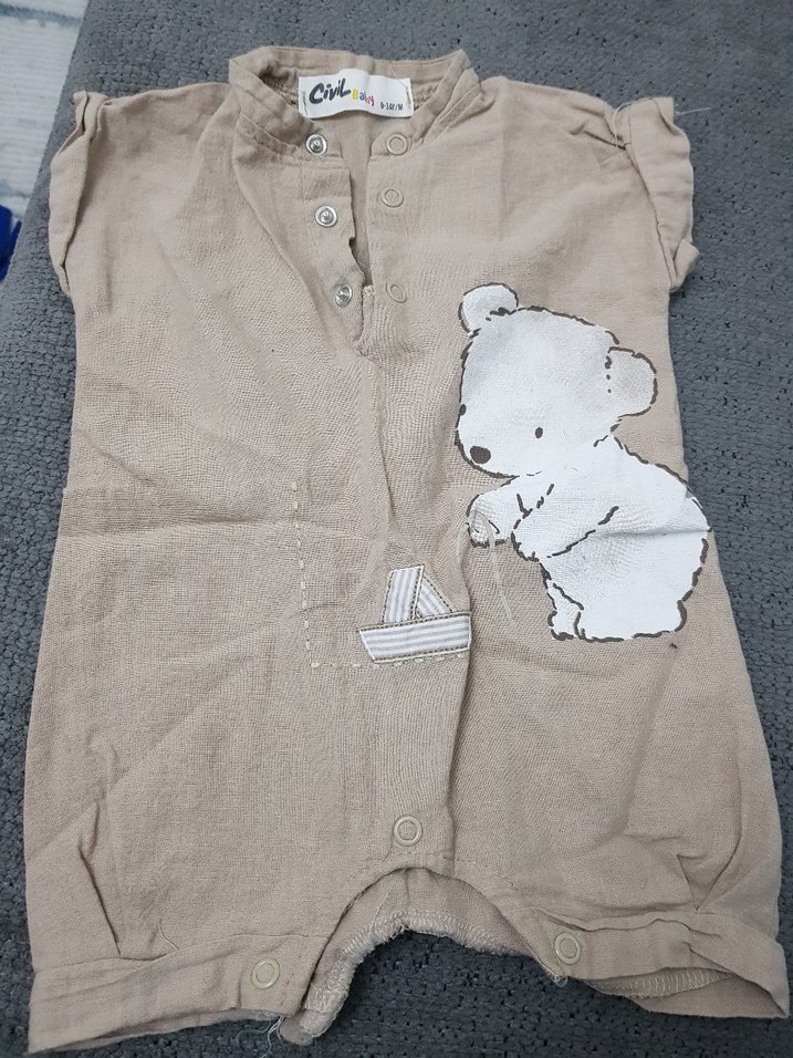 Bej renkli bebek erkek tulumu, kısa kollu ve yuvarlak yakalıdır. Düğmeli ve yumuşak keten kumaştan üretilmiştir, üzerinde baskılı ayıcık deseni vardır.
