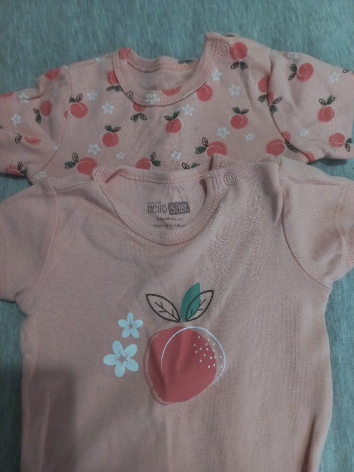 Kısa kollu, yuvarlak yakalı, pastel pembe renkte meyve desenli, düğmeli bebek kız body.