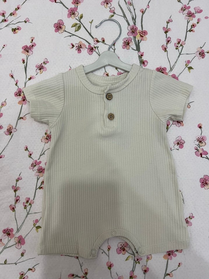 Pastel beyaz, kısa kollu, önünde düğme detaylı yumuşak dokulu bebek tulumu. Cigit