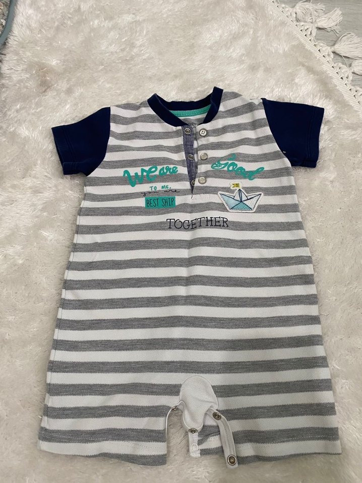 Kısa kollu, düğmeli bebek tulumu, lacivert kollar ve gri beyaz çizgili gövdeye sahiptir. Yumuşak ve sıcak kumaştan, baskılı ve sokak stili için uygundur. Sorunsuz ve temizdir 9-12 ay