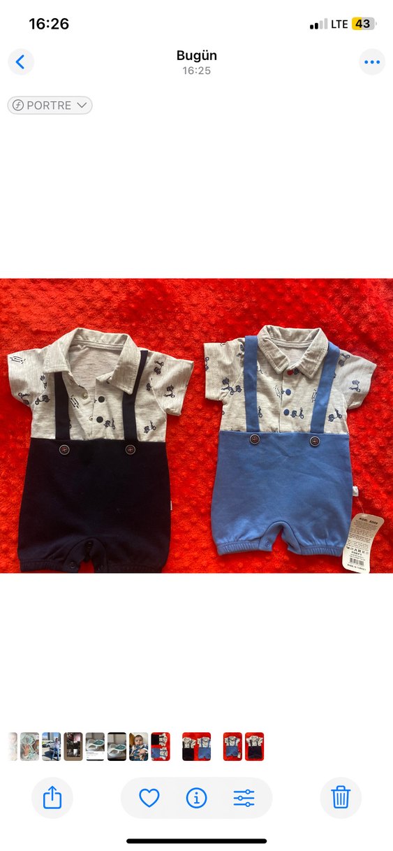 Aynı takımdan elimde iki adet vardı fotoğraftakileri hiç kullanmadım birinin etiketini yanlışıkla kopardım 0-3 ay Pamuk kumaştan, kısa kollu, düğmeli bebek tulumları. Gri zemin üzerine baskılı desenler ve siyah veya mavi askılı tarzda tasarlanmıştır. Rahat sokak giyimi stilinde.