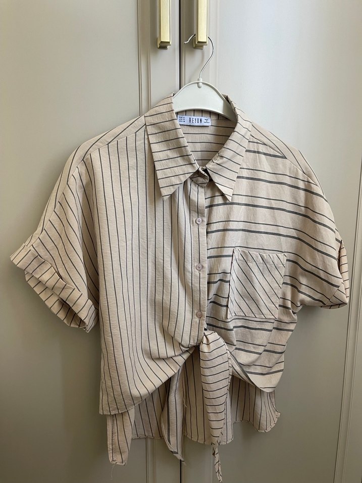 Bej renkli keten gömlek, kısa kollu ve bol kesimdir. Çizgili deseni, düğmeli önü ve yakalı tasarımıyla günlük sokak stiline uygundur.