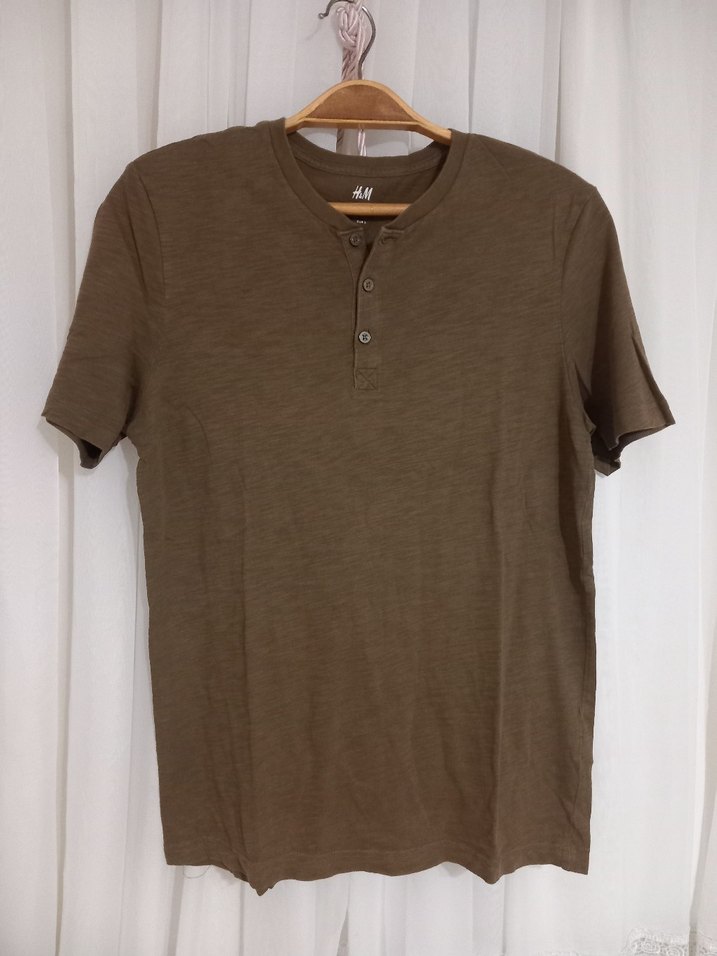 Bej renkte, kısa kollu, düğmeli yuvarlak yaka ve bol kesimli erkek tişörtü. Keten kumaştan, günlük rahat sokak stili için uygundur.