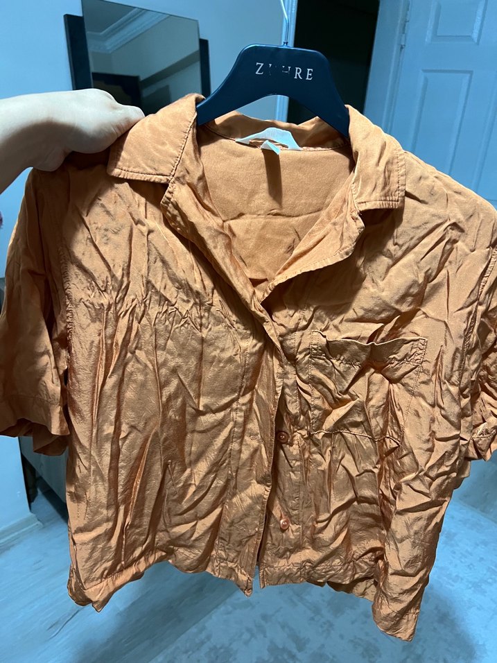 Kısa kollu, yakalı ve düğmeli bej keten gömlek. Rahat kesim ve normal boy ile günlük kullanıma uygundur. ✨