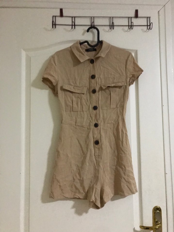 Bej, düğmeli, kısa kollu, yakalı ve fitted kesimli kısa tulum. Minimalist ve sokak stiliyle günlük kullanıma uygun. (Tekliflere açığım)