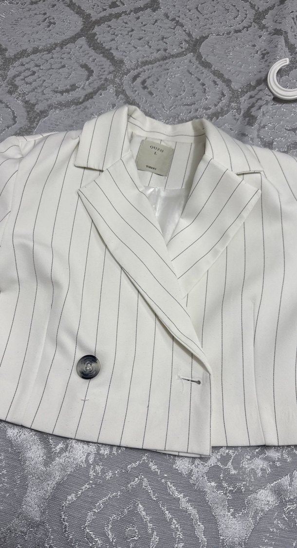 Beyaz, düğmeli ve kısa kollu blazer. Keten kumaştan, çizgili ve kısa boyda. Trendy ve rahat ofis stiline uygun.