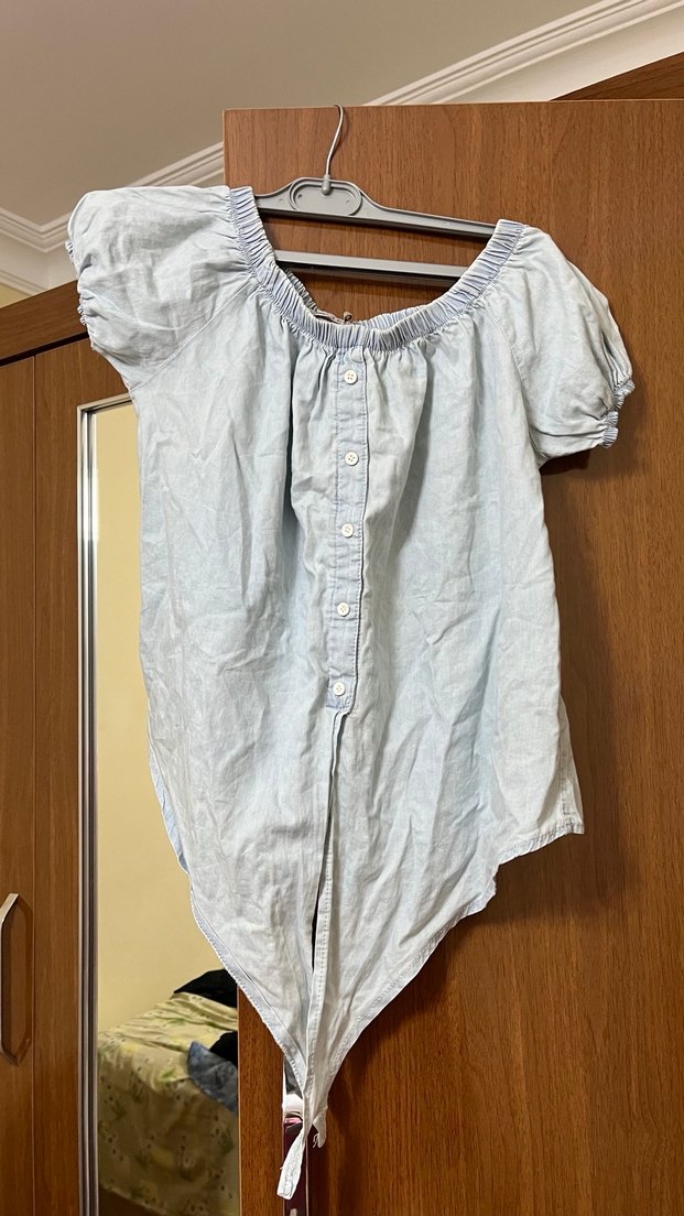 Beyaz keten kumaştan, düğmeli, kısa kollu ve straplez yakalı bol kesim hamile bluzu. Günlük rahat kullanım için midi boyda.