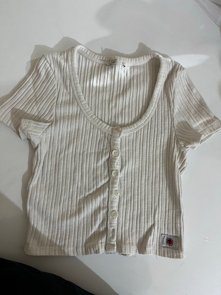 Pamuklu, düğmeli ve kısa kollu, ribanalı dokulu beyaz tişört. Günlük kullanıma uygun, rahat ve şık görünümlü.