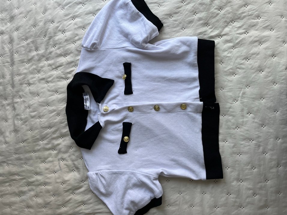 Pamuklu, kısa kollu, düğmeli beyaz crop. Siyah yakalı ve manşet detaylarıyla Paris tarzı, günlük kullanım için uygun.