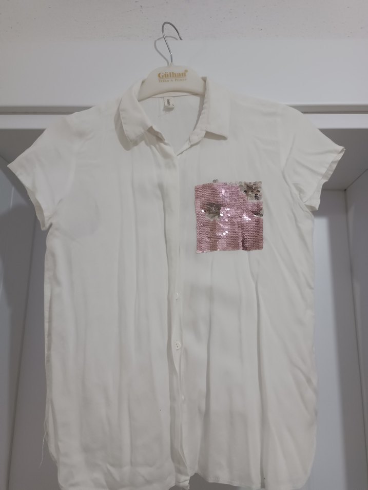 Hafif sentetik kumaştan, kısa kollu, yakalı ve düğmeli beyaz gömlek. Pembe payet cep detayıyla dikkat çeker. Rahat kesim, günlük kullanıma uygun.