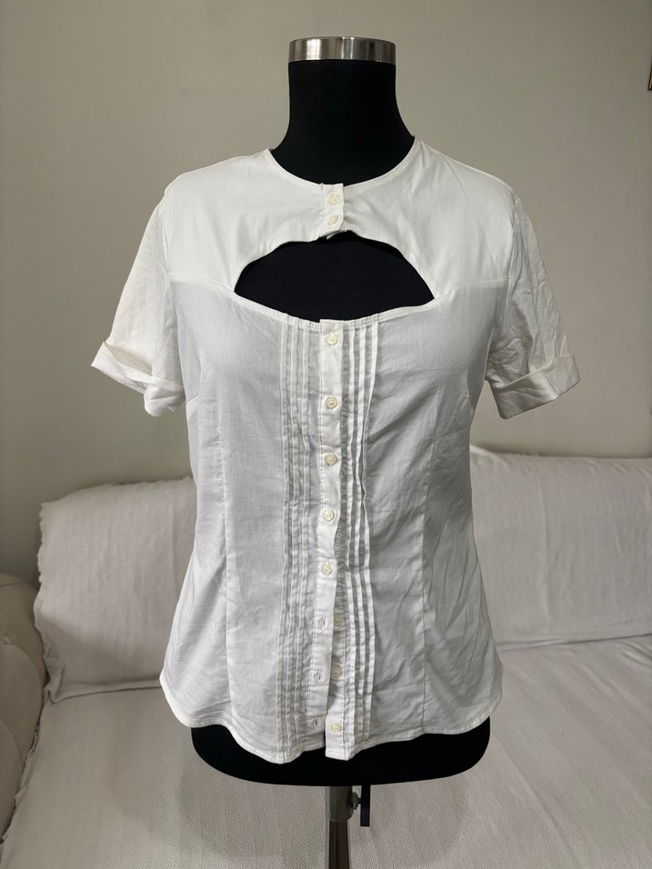 Beyaz gömlek, kısa kollu, kayık yaka ve düğmeli ön kapama ile pilili detaylara sahiptir. Regular fit, minimalist bohem stilde, ofis kullanımı için uygundur.