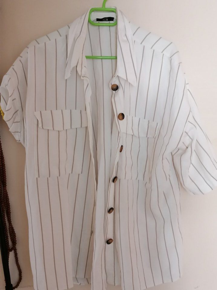 Dikey çizgili, kısa kollu, düğmeli beyaz keten gömlek. Gevşek kesim ve kesik yaka detaylı, günlük rahat stil için uygun.