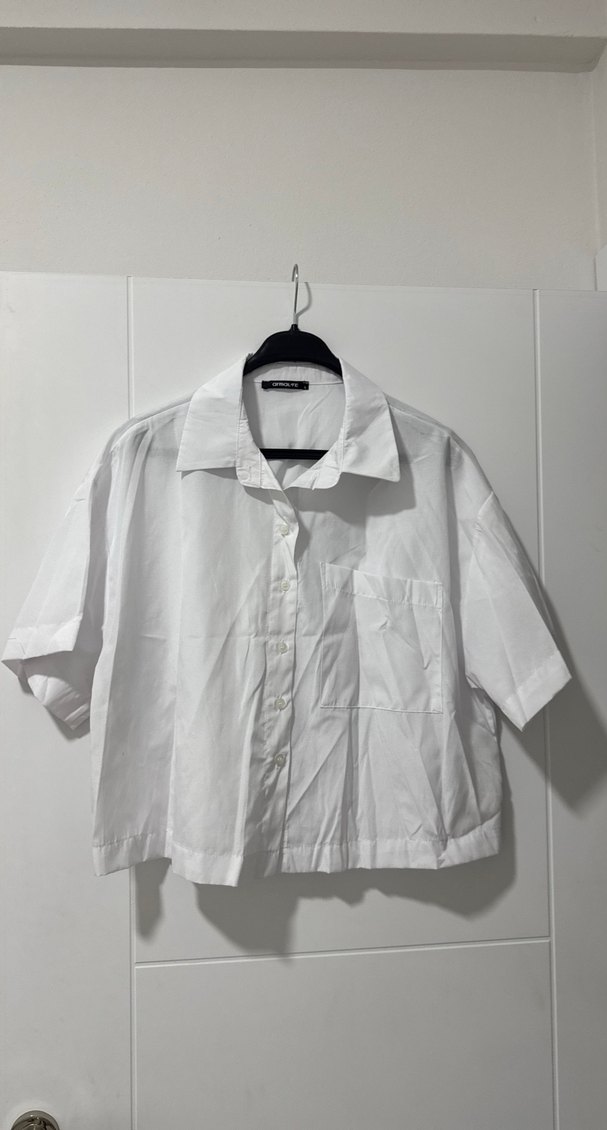 Kısa kollu, düğmeli beyaz keten gömlek. Salaş kesim ve normal boyda, günlük kullanıma uygun sade ve minimalist tarzda.