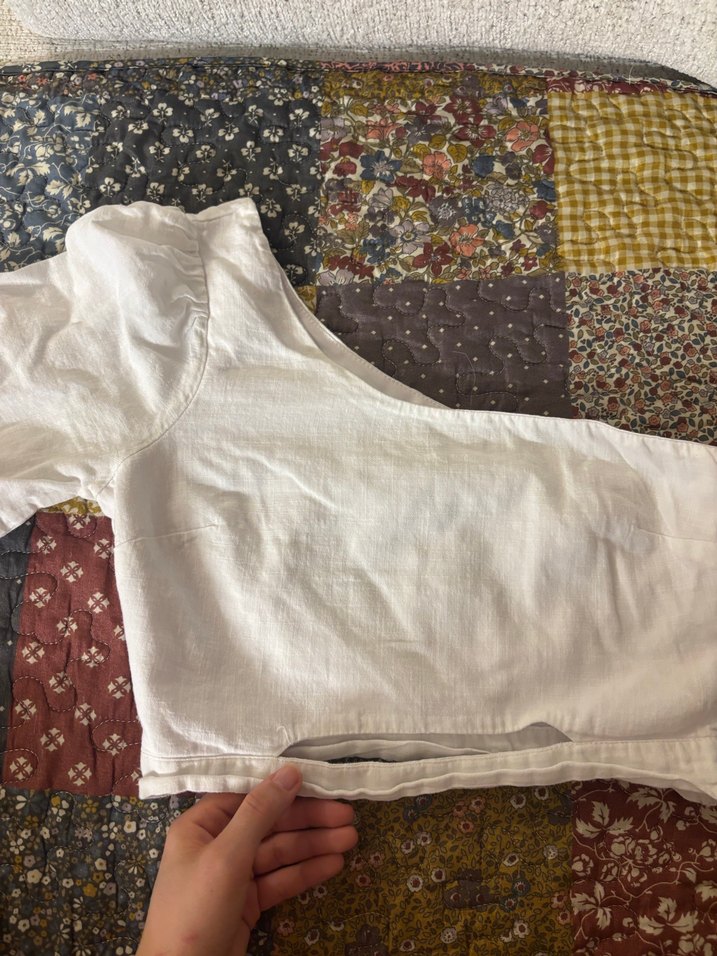 Keten kumaştan, kısa kollu, düğmeli ve straplez yakalı beyaz hamile bluzu. Bohem tarzıyla günlük kullanıma uygundur.