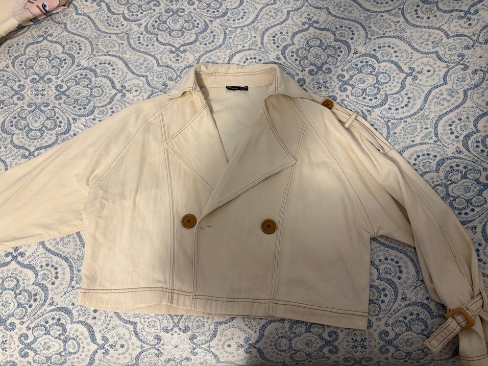 Düğmeli, kısa kollu, keten kumaştan yapılmış beyaz kadın ceket. Normal midi boyda, bol kesim ve notched yaka detaylıdır.