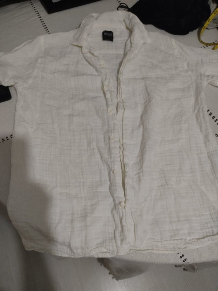 Nefes alabilir keten kumaştan, düğmeli ön kısmı ve yakalı tasarımı ile kısa kollu, bol kesim beyaz kadın gömleği. kalın ketendir mevsimlik.kombin tamamlayıcı