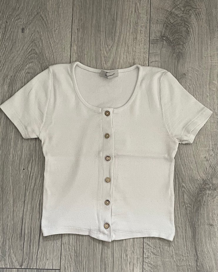 Kısa kollu, bisiklet yaka ve düğmeli önü olan, pamuklu kumaştan beyaz renkli tişörtü. Sokak stiline uygun.