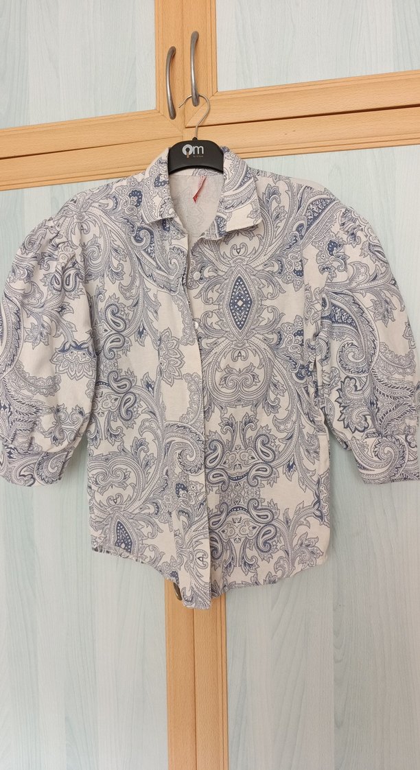 Düğmeli, kısa kollu, yakalı ve düz kesim kadın gömlek. Nefes alabilen keten kumaştan, vintage esintili mavi beyaz batik desenli. Günlük kullanım için uygundur.