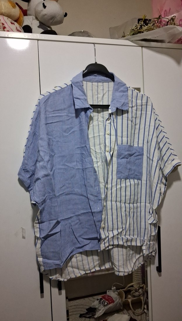 Düğmeli, kısa kollu, keten kumaştan kadın gömleği. Mavi ve gri tonlarda çizgili, rahat kesim, gündelik sokak stili için uygun.
