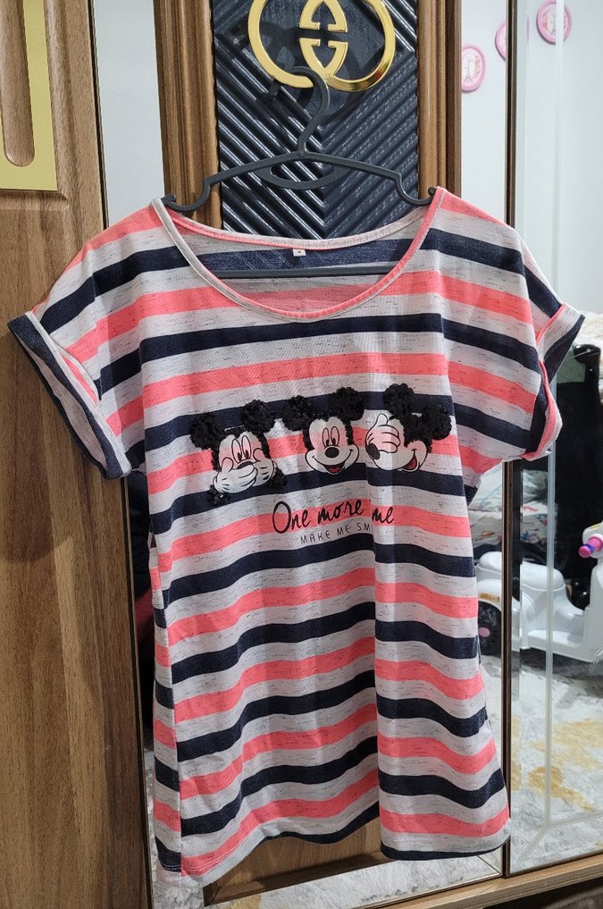 Pembe, gri ve siyah çizgili, pamuklu, kısa kollu, düğmeli, rahat kesim kadın tişörtü. Yuvarlak yaka, evde rahat kullanım için uygundur.