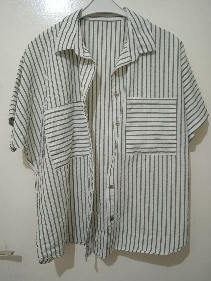 Keten kumaştan, kısa kollu, düğmeli ve yakası kesik detaylı rahat kesim kadın gömlek. Dikey çizgiler ve iki ön cep bulunur. Günlük kullanıma uygundur.