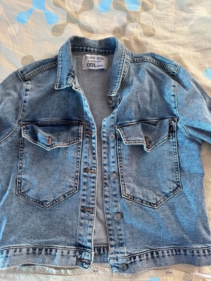 Düğmeli, kısa kollu, cepli ve notched yakalı bol kesim denim ceket. Mavi-gri tonlarında günlük kullanıma uygun rahat stil. Marka etiketi 'ODL' yazılı.