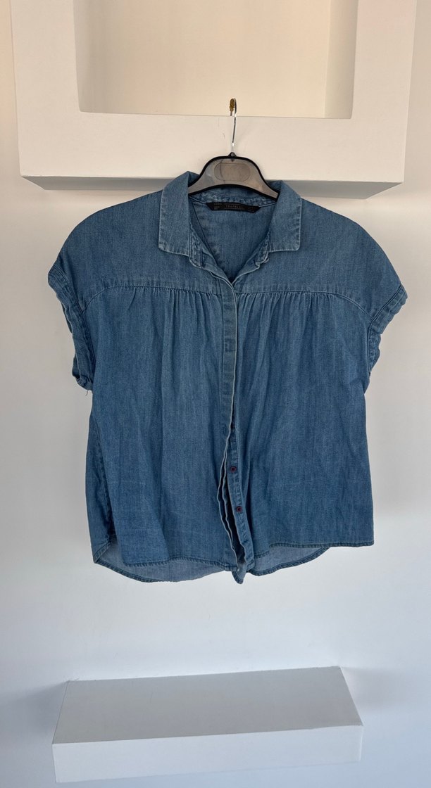 Mavi denim gömlek, kısa kollu ve yakalı, düğmeli önü ve rahat kesimiyle günlük sokak stiline uygundur.