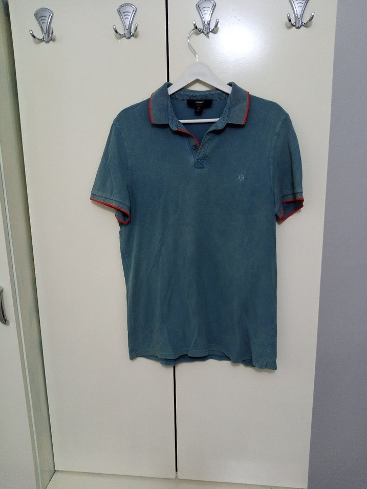 Düğmeli, kısa kollu, yakalı ve fitted kesime sahip denim polo tişört. Gri-mavi tonlarında, desen içermeyen ve sokak stiline uygun.