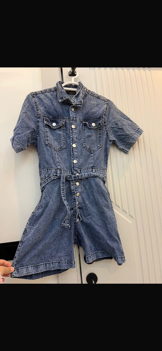 Mavi denimden yapılmış, kısa kollu ve düğmeli, yakası kesik detaylı tulum. Belde kuşak ve iki cep bulunur, günlük rahat kullanım için uygundur.