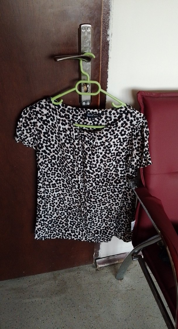 Düğmeli önü, yuvarlak yakalı, kısa kollu ve bol kesim kadın bluz. Sentetik kumaştan, koyu kahverengi desenli, günlük rahat kullanıma uygun.