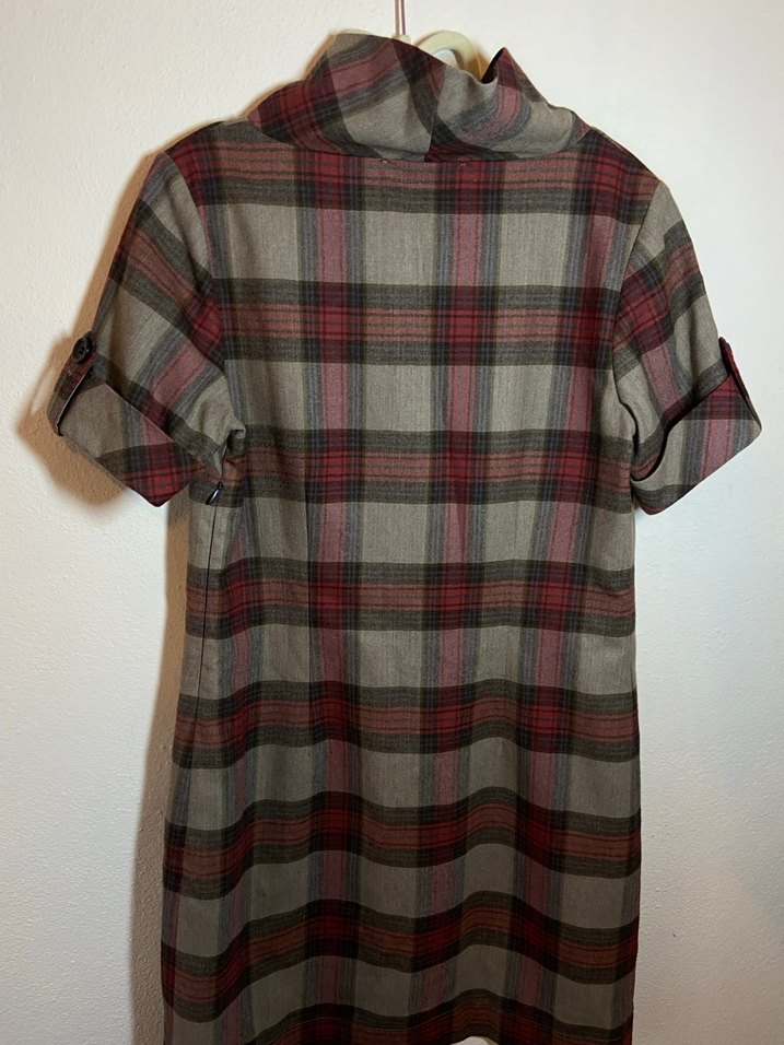 Düğmeli kısa kollu, salaş kesim midi elbise, kahverengi ve gri tonlarında ekose desenli, rahat ve konforlu dokuma kumaştan yapılmıştır.